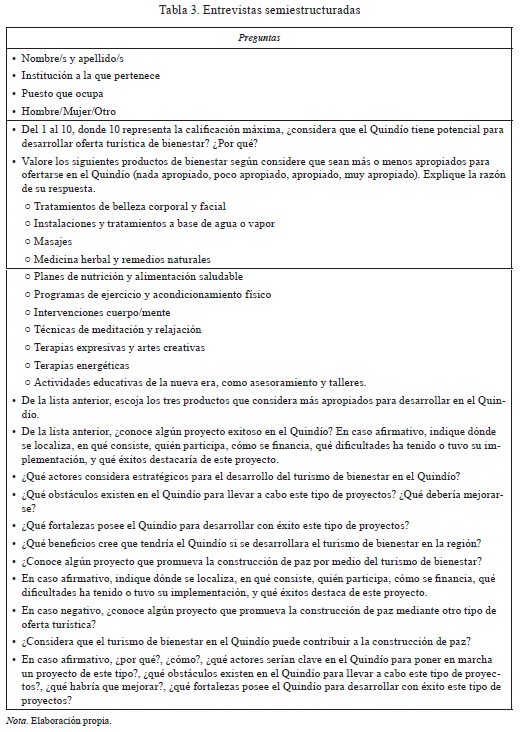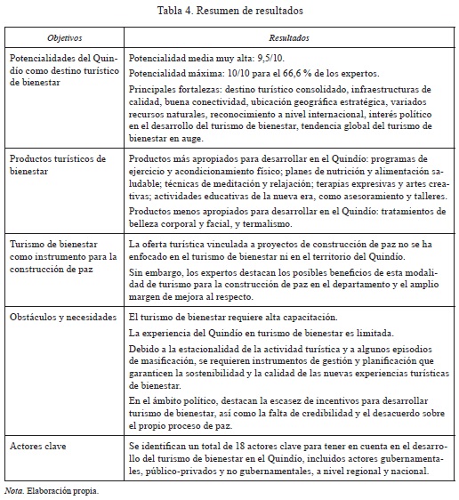 La revisión documental y la realización de entrevistas a diez expertos en turismo en el Quindío, en turismo de bienestar y en turismo y posconflicto en Colombia han permitido hallar respuestas a las preguntas clave de esta investigación. El Quindío tiene potencial para ser un destino de bienestar. En este sentido, el análisis de los datos ha permitido concluir que entre sus principales ventajas están sus características geográficas, sus recursos naturales, el reconocimiento y posicionamiento de que goza, así como el interés político en promover esta tipología turística. Sin embargo, también se han detectado necesidades y obstáculos en cuanto a productos, gestión del destino y políticas, que requieren ser abordados. La falta de capacitación y especialización en temas de turismo de bienestar, los costes de inversión en infraestructuras, las problemáticas relacionadas con la estacionalidad y las desavenencias respecto al proceso de paz son los puntos más críticos.