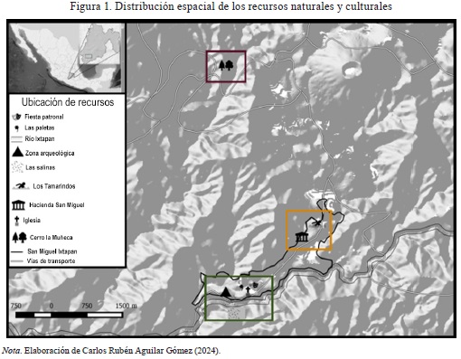 La distribución espacial de los recursos (Figura 1) muestra que la zona arqueológica y su Museo de Sitio, las salinas, la iglesia de San Miguel, la paletería y la fiesta del Señor Milagroso están concentrados en una misma área. Esa proximidad podría favorecer el diseño de una experiencia turística integrada, centrada en dichos atractivos. Por otro lado, los balnearios Las Ranas y Los Tamarindos, junto con la hacienda de San Miguel, están algo alejados de los demás; sin embargo, podrían incluirse en un producto turístico complementario a partir de una oferta enfocada en actividades recreativas acuáticas. Finalmente, el único recurso que se encuentra apartado del resto es el cerro de la Muñeca, razón por la cual se debe evaluar su integración a un producto de turismo rural, ya que su distancia representa una dificultad para el traslado de personas. No obstante, en este cerro podrían desarrollarse diversas actividades, como senderismo, ciclismo de montaña, observación de fauna o campamentos.