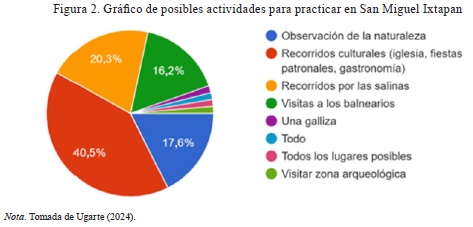 En cuanto a las posibles actividades para practicar en esta localidad (Figura 2), los entrevistados refirieron las siguientes: recorridos culturales (40,5 %) que contemplen la arquitectura, las fiestas y la gastronomía, entre otros elementos; paseos por las salinas (20,3 %) para conocer el proceso de extracción de la sal; observación de la naturaleza (17,6 %) y visitas a los balnearios (16,2 %).