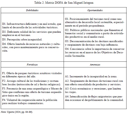El diagnóstico turístico efectuado en la localidad de San Miguel Ixtapan evidenció un escenario ambivalente para la implementación del turismo rural. Por una parte, se destacan la presencia de recursos naturales y culturales con potencial para el diseño de actividades turísticas, la existencia de un mercado interesado en ellas, la disposición de la población local para involucrarse en su gestión y una gobernanza estable. En este sentido, la comunidad presenta condiciones favorables para integrarse al mercado turístico como un destino de turismo rural en el sur del Estado de México.