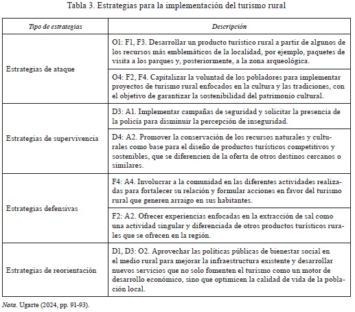 La situación de la localidad refleja varias oportunidades para la implementación del turismo rural, pero también algunos desafíos que requieren atención. La infraestructura y los servicios básicos de apoyo al turismo, así como el clima de inseguridad que se percibe en la zona, pueden constituir factores restrictivos para el desarrollo de esta modalidad turística. Por otra parte, algunas oportunidades pueden capitalizarse por medio de la puesta en valor de recursos culturales de gran relevancia, de la voluntad de los pobladores para trabajar de forma organizada y de los apoyos públicos para poner en marcha proyectos productivos. Por lo anterior, es importante formular estrategias que permitan conocer con exactitud por qué y cómo se podría implementar el turismo rural.