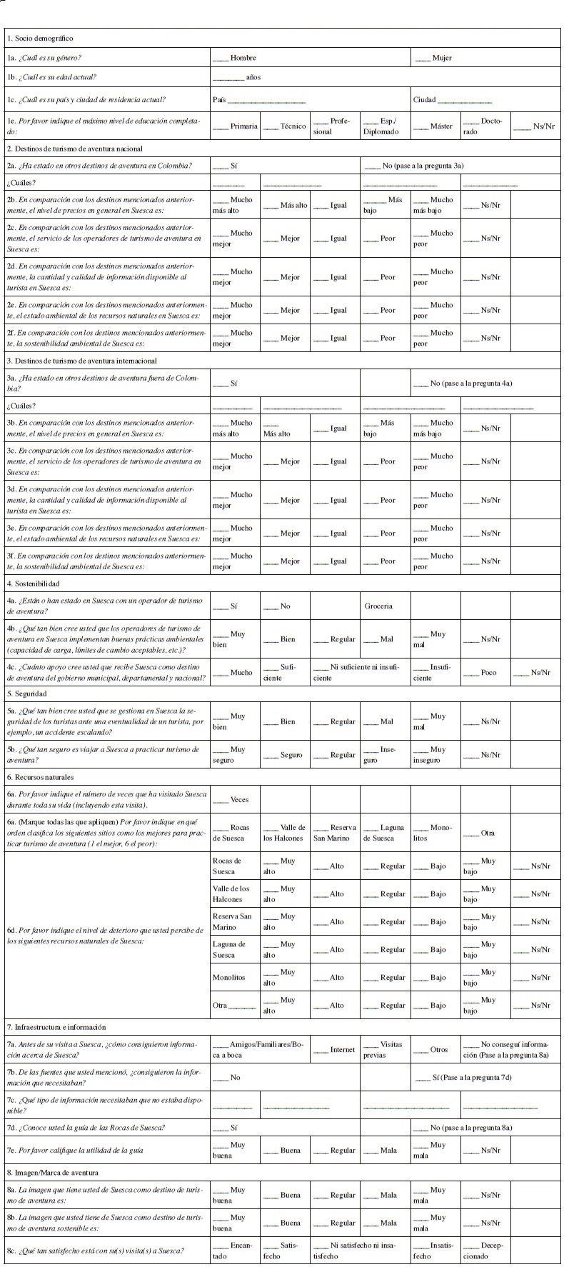 However, this study has a limited reach in the sense that only pilot tests were conducted, hindering the generalization of the information gathered, and also because direct observation of partner destinations could not be carried out. A big improvement could be achieved by visiting these destinations and carrying out a survey and direct observation and participation to obtain higher amounts of information that will be useful for improving the quality of Suesca's adventure tourism supply.