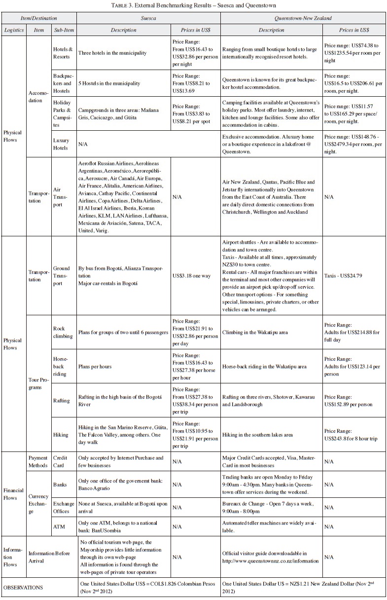 As for the external benchmarking exercise, huge gaps were found when comparing Suesca with other famous adventure tourism destinations. The most important lags appear in the financial and information flows, where Suesca sees undermined its capacity of delivering aquality experience for adventure tourists. Ahigh amount of governmental support must be given if it wants to become a highly visited adventure destination.
