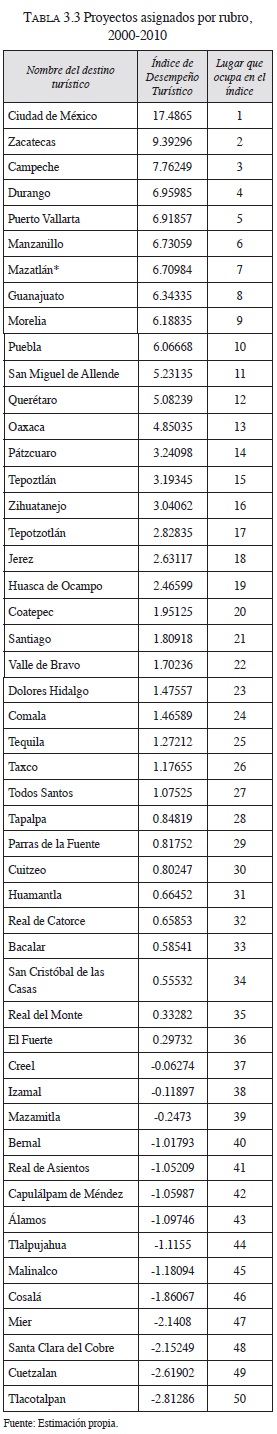 En el conjunto de destinos seleccionados se invirtieron 4,903 millones de pesos entre los ámbitos federal, estatal y municipal, y se realizaron 640 proyectos durante el periodo de 2000-2010 (véase tabla 3.1). Sumando losmontos asignados a los 50 destinos y el número de proyectos da un total de 1,173.393 millones de pesos y 73 proyectos durante 2010. Esto significa que el análisis de los 50 destinos equivale a un 72% de los montos asignados y a 25% de los proyectos que se implementaron durante 2010, cuestión que permite pensar que los resultados pueden ser una muestra del conjunto de todos los destinos turísticos que han recibido apoyo a través de los CCRR.