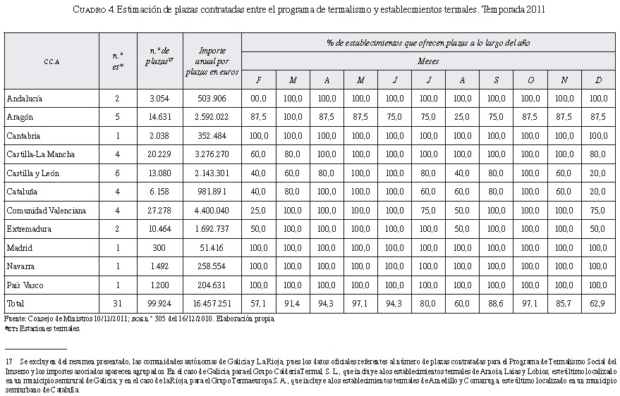 Así mismo, a partir de las plazas reales contratadas entre el Imserso16 y los establecimientos termales, se puede determinar que su reparto a lo largo del año les asegura un funcionamiento constante, permitiéndoles mitigar el principal problema que afecta en general al turismo y en particular al desarrollado en el espacio rural: la estacionalidad. En consecuencia, representa una alternativa más efectiva para mantener una economía relativamente próspera en los territorios donde este turismo se desarrolla (cuadro 4).