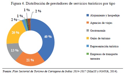 En el Distrito de Cartagena, la participación de la hotelería corresponde al 40 %, seguida de un 21 % por parte de las agencias de viajes; en tercer lugar están los guías de turismo (20 %) y, por último, la gastronomía (13 %) (MinCIT y FONTUR, 2014. p. 24)