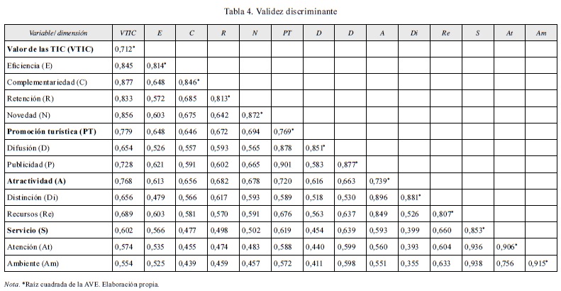 En la figura 2, se muestra que el valor de las TIC tiene una influencia altamente significativa, positiva y fuerte sobre la promoción turística (β = 0,779; p < 0,001), la atractividad (β = 0,768; p < 0,001) y el servicio (β = 0,602; p < 0,001) de los museos; sobre la base de estos datos, se soportan las hipótesis H1, H2 y H3. Por otro lado, el valor de las TIC tiene una capacidad predictiva (R 2aj) de gran efectividad y efectos de gran tamaño (f2), y logra modificar el comportamiento del 60 % de la promoción turística, del 58 % de la atractividad y del 36 % del servicio (tabla 9).