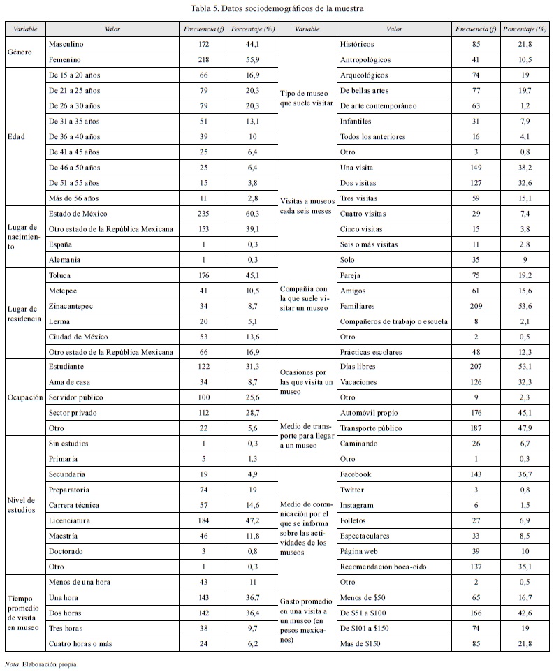 Al considerar como unidades de análisis a los visitantes de museos de la ciudad de Toluca, se utilizó un muestreo no probabilístico. La técnica de selección fue por sujetos voluntarios y contó con la participación de 390 personas de 14 museos (tabla 1). La técnica para la recolección de datos fue una encuesta autoadministrada, la cual se aplicó de enero a marzo de 2020 dentro de los museos y a distancia, en este caso, por medio de un formulario de Google Forms. En esta etapa del trabajo de campo, los respondientes fueron informados sobre el uso académico de los datos, así se garantizaron su anonimato y confidencialidad.